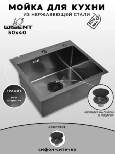 Кухонная мойка из нержавеющей стали WS35040B WISENT (50х40 см) Графит PVD с сифоном-ведерко