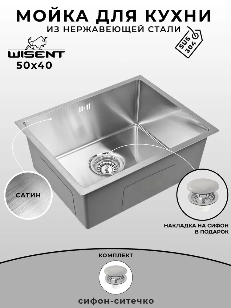 Кухонная мойка из нержавеющей стали WS35040-Z WISENT (50х40 см) Сатин, сифон с ситечком